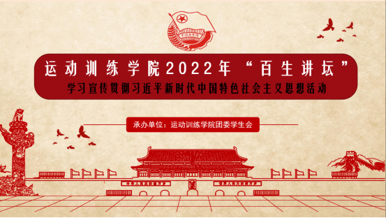 为庆祝中国共产主义青年团建团100周年,喜迎党的二十大胜利召开,深入推进习近平新时代中国特色社会主义思想“进支部、进社团、进网络、进团课”,增强青年学生政治责任感和历史使命感,4月28日晚,运动训练学院于东教学楼第一报告厅举办“百生讲坛”优秀主讲人及活力团支部决赛。武汉体育学院团委书记张广弟,运动训练学院党委书记徐法,党委副书记、副院长许超,校团委专职团干田一平,运动训练学院团委书记于鹏、各年级辅导员出席本次活动,武汉体育学院团委兼职副书记、体育教育学院团委书记王珂,武术学院团委书记刘鹤童,竞技体育学院团委书记彭然担任本次活动评委。