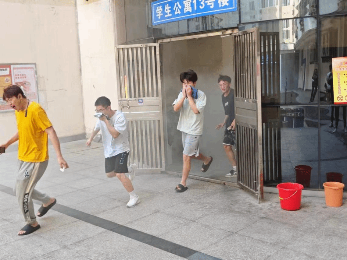 下午4点,消防队员在13栋宿舍楼内释放烟雾,模拟制造“火灾现场”,标志着演练正式开始。现场烟雾弥漫,楼内的同学们在楼层消防安全员的指挥下快速疏散。大家沉着冷静,用手、湿毛巾等捂住口鼻,弯腰沿消防通道向门外进行疏散,快速有序撤离楼栋,到达安全位置。