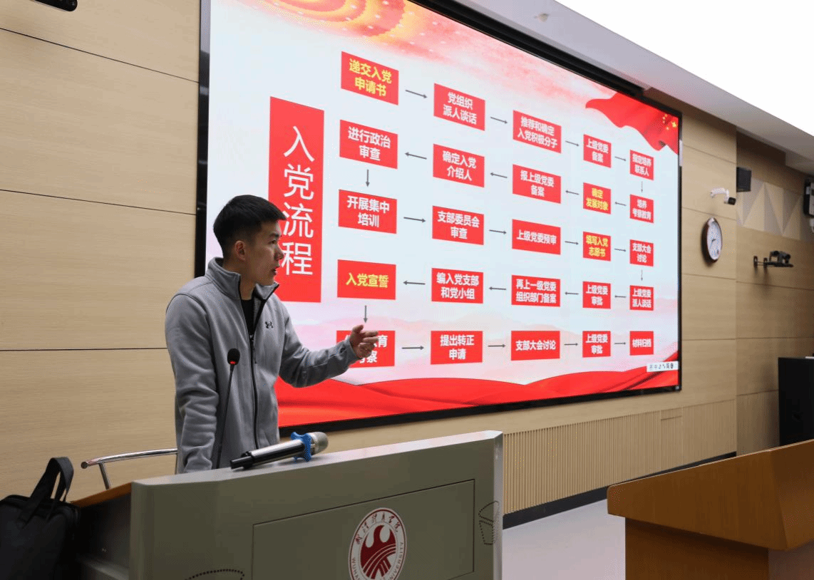 彭然老师从申请入党、入党积极分子的确定和培养教育、发展对象的确定和考察、预备党员的接收、预备党员的教育考察和转正等五个方面详细介绍了党员发展的工作流程和要求,让学员们对发展党员的流程有了更清晰的认识,并鼓励学员们要做“爱国、励志、求真、力行”的表率,坚持奋斗、积极向党组织靠拢。