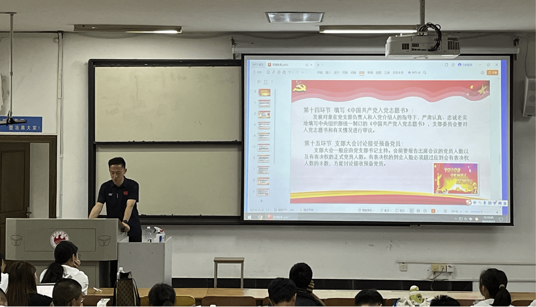 王十乐老师详细讲解了从递交入党申请书到成为正式党员的全过程,让入党积极分子对入党流程有了清晰的认识。同时,就入党申请书等常用材料的撰写要点进行讲解,强调材料撰写需真实反映个人思想变化、学习工作情况,并注重格式规范、语言准确。
