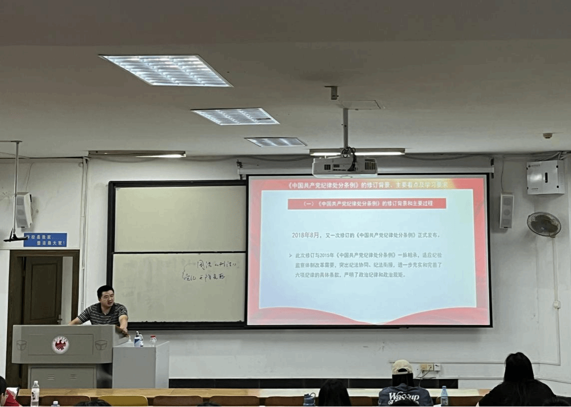 吴彰忠老师聚焦《中国共产党纪律处分条例》的修订背景、主要看点及学习要求,深入浅出地分析了新时代党的纪律建设面临的新挑战与新要求,阐述了《条例》在强化纪律约束、完善处分制度等方面的主要看点。他鼓励同学们不仅要学懂弄通,更要做到知行合一,将党的纪律规矩内化于心、外化于行。