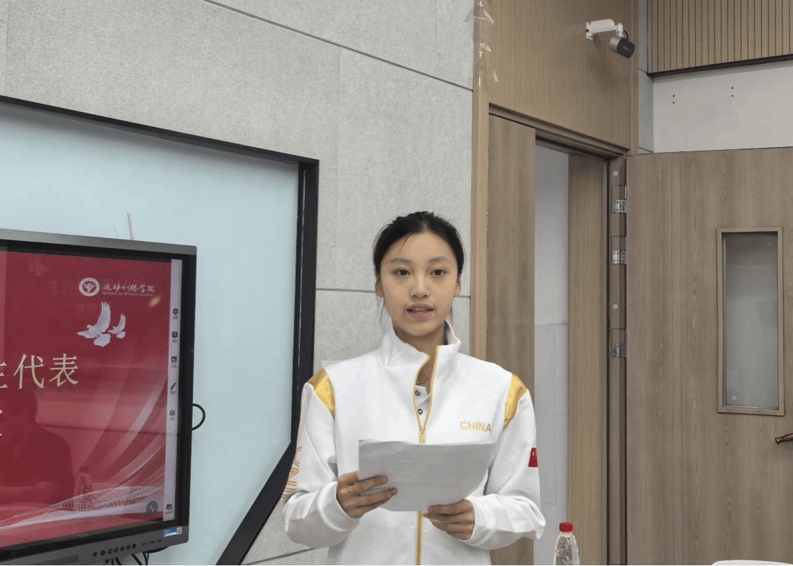 2024级刘羽欣同学作为新生代表发言。她首先对拥有进入实验班的机会而感到荣幸与感激。并表示定将牢记国家对新时代青年的期望与要求,不负时代、不负韶华,脚踏实地、踔厉奋发,为实现体育强国贡献出武体运训人的力量!