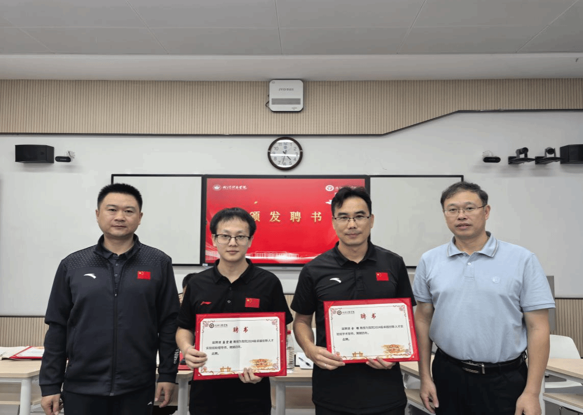 随后,运动训练学院党委书记徐法,党委副书记、副院长宗斌为实验班导师余银教授和唐宏霖老师颁发聘书。