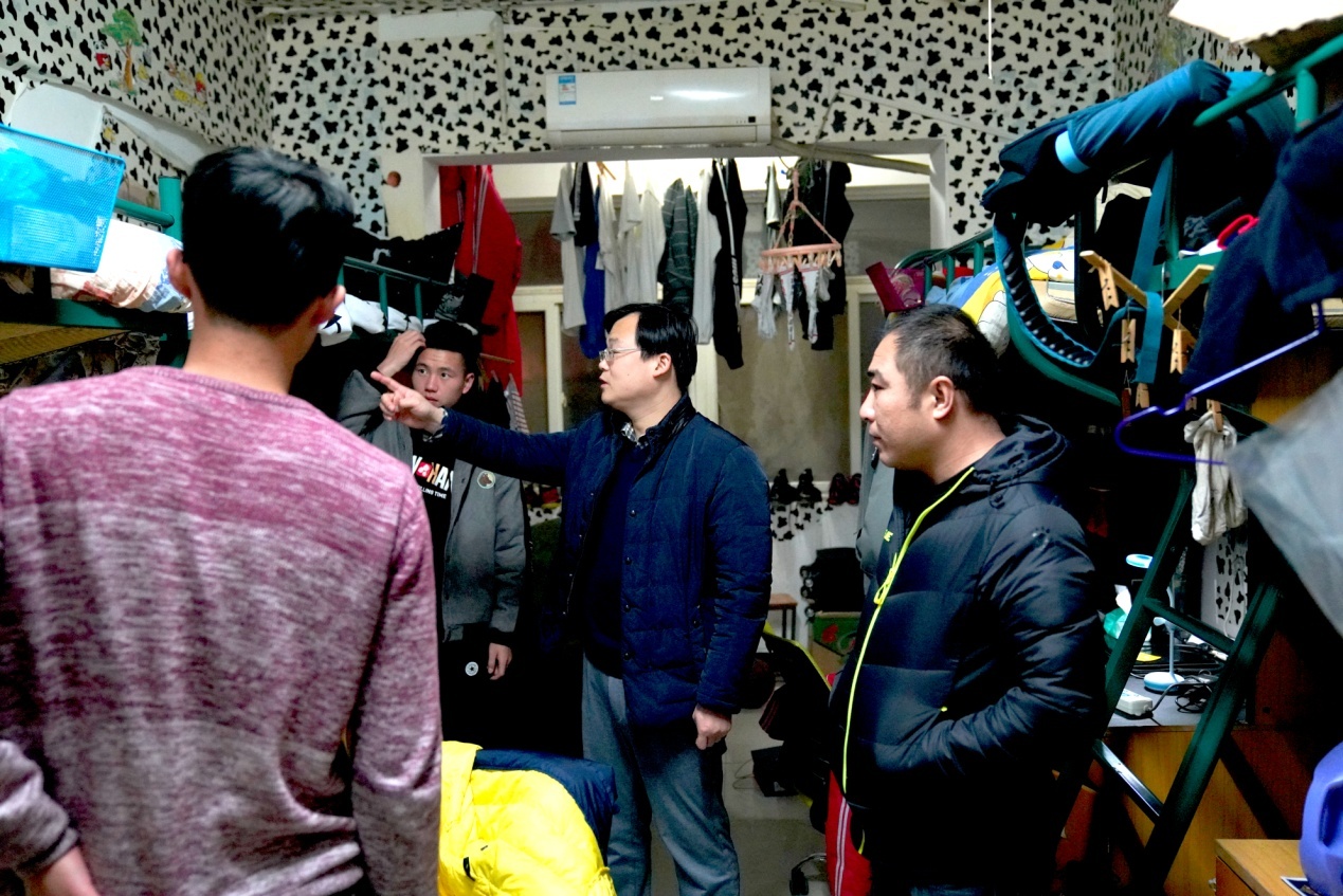 党委书记徐法与学生干部对每个房间都进行细致入微的检查