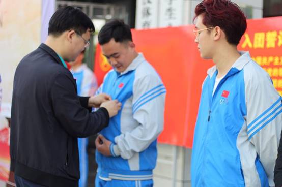运动训练学院党委副书记、副院长许超为新团员佩戴团徽