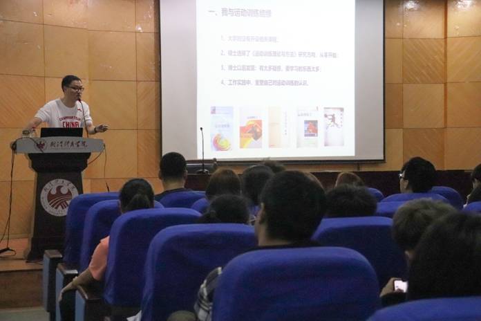 2019年4月18日晚,运动训练学院在东教学楼第二报告厅举办了《挑战与突破—竞技运动理论与实践感悟》专题讲座。本次讲座由运动训练教研室书记高平作为主讲人,100余名学生参加本次活动。