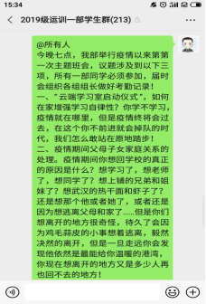 为坚决落实《中共武汉体育学院委员会关于进一步加强疫情防控工作的通知》文件精神,武汉体育学院运动训练学院2019级一部辅导员吴彰忠带领学生们在运动训练学院党委和学工部“停课不停学,脱校不脱管”的指导思想下抓住疫情防控 “机遇期”,立足辅导员岗位,认真开展育人工作。