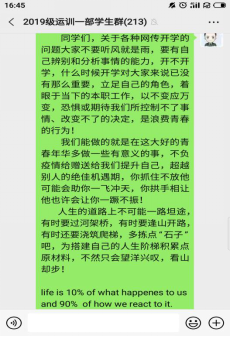 整个疫情期间收到学生咨询最多的就是关于“何时才能开学返校”的问题,辅导员吴彰忠在平时与学生及家长的交流过程中发现,疫情期间因长期居家隔离部分学生产生了烦闷、急躁、焦虑等不良情绪,由于调节不当,往往会把这种不良情绪带到了日常生活中,影响了家庭代际关系的和谐,具体表现为子女与父母争吵,导致部分学生萌生了“迫切返校”的念头,严重的可能会产生离家出走的风险。为了预防此类现象的发生,辅导员吴彰忠在武体学工部和运动训练学院党委关于“加强疫情期间学生心理健康教育工作”的指导下,邀请学生及其家长共同开展了一系列以“疫情期间家庭代际关系处理”为主题的线上心理教育活动,通过专题心理教育活动的开展,学生和家长们掌握了一些缓解心理压力简单且有效的方法,学生咨询何时返校的问题少了,家长们也普遍反映孩子也学乖了不少。