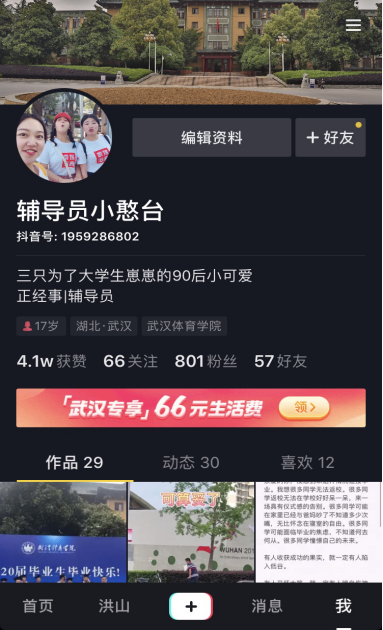 我部以“辅导员小憨台”抖音号为平台,展示辅导员的工作生活状态,分享师生日常的趣味瞬间,突显了体育生的积极风采,抒发了万千学子的所思所想,成为运动训练学院师生共同学习进步、校友家长踊跃互动的思想教育阵地。“辅导员小憨台”抖音号自4月份创建以来,共发布29个作品,包含校园风光、居家生活展示、体育生特长展示、就业政策解读、毕业论文答辩等多方面内容,浏览量超2000000次,点赞量40000余次,广受师生喜爱和好评。