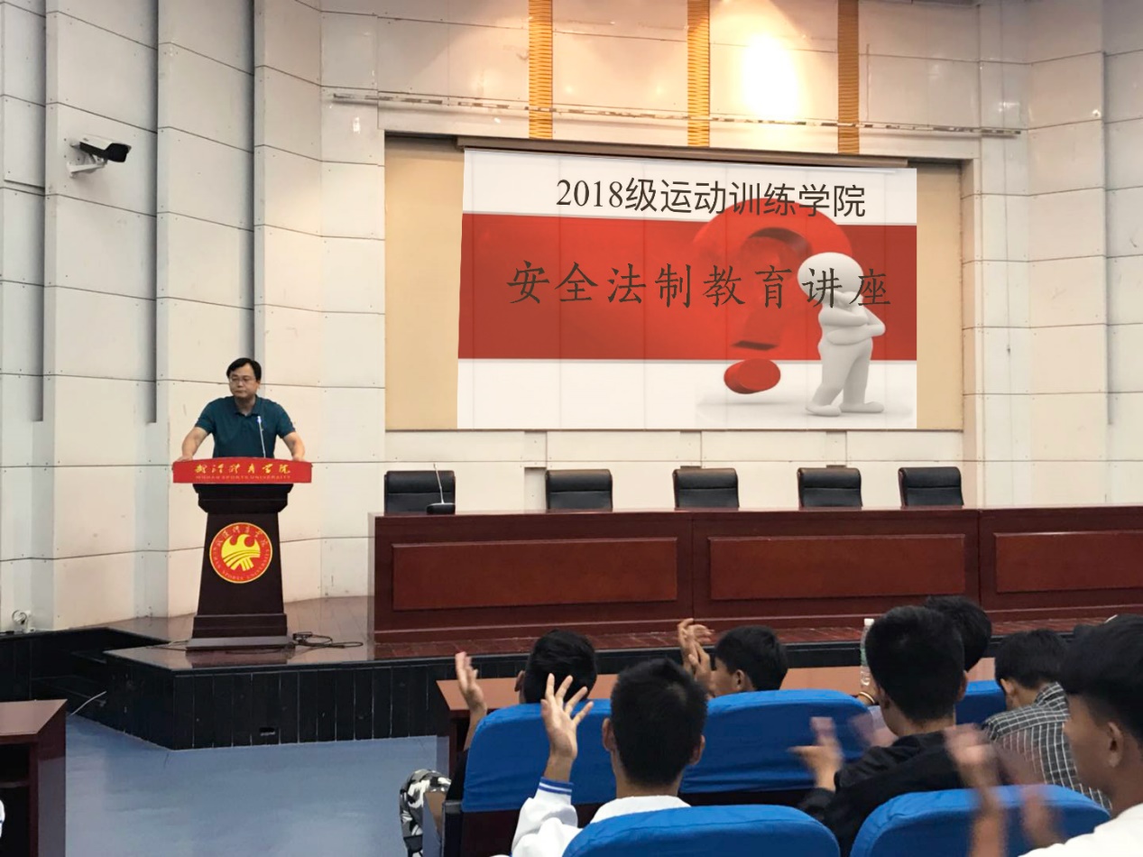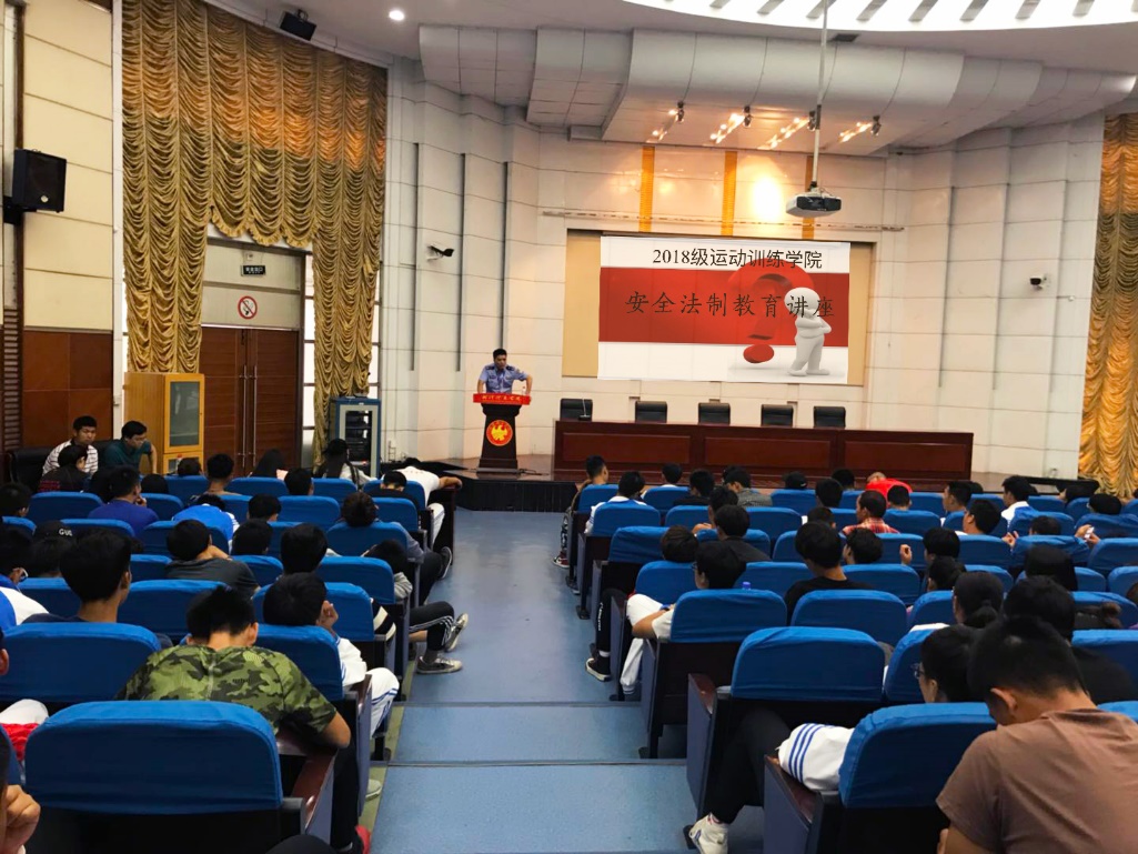 2018年9月27日上午,在东教学楼第三报告厅开展了运动训练学院2018级新生入学安全法制教育讲座。我院诚挚邀请了卓刀泉派出所副所长钱祖国作为主讲人,运动训练学院党委副书记、副院长许超出席了本次讲座。